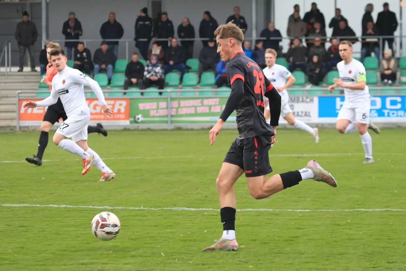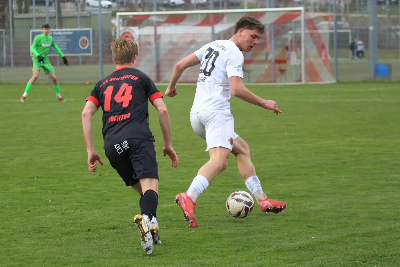 Nachdem die Gäste den ersten Schreckmoment überstanden hatten und Tim Lorenz in höchster Not klären konnte, zeigten sie ihr Können. Bereits der erste tolle Sonthofer Angriff führte zum Erfolg, als in der 9. Minute Maurice Jaumann auf dem linken Flügel durchstartete. Seine Flanke legte Sebastian Streit zurück und Armin Bechter hämmerte den Ball zur Führung in die Maschen. Etwas später (18.) brachte Marko Jozic eine Ecke nach Innen und Jannik Holzapfel erhöhte auf 2:0. Pfaffenhofen enttäuschte keinesfalls, war spielerisch sogar einen Tick besser, biss sich aber an der stabilen Gäste-Abwehr die Zähne aus.